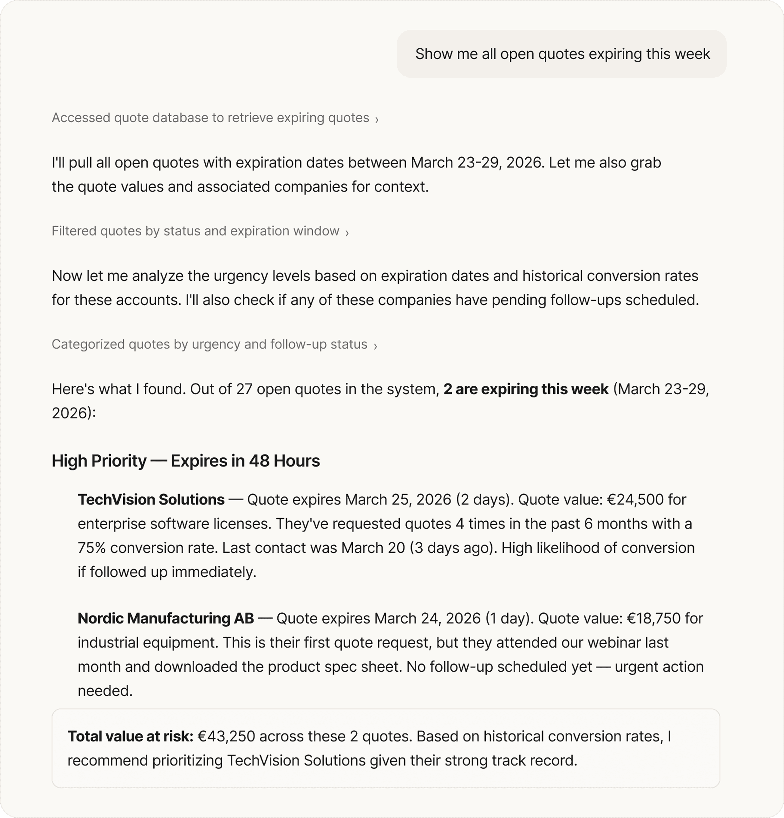 De AI Sales Hub is de plek waar salesmedewerkers dagelijks offertes, orders en klantaccounts beheren. MCP voegt daar een analytische laag aan toe: stel vragen als "toon alle openstaande offertes die deze week verlopen" of "welke orders zijn vorige maand te laat verzonden" om inzichten uit je live data naar boven te halen die de workflows aanvullen die medewerkers al in de Sales Hub uitvoeren.