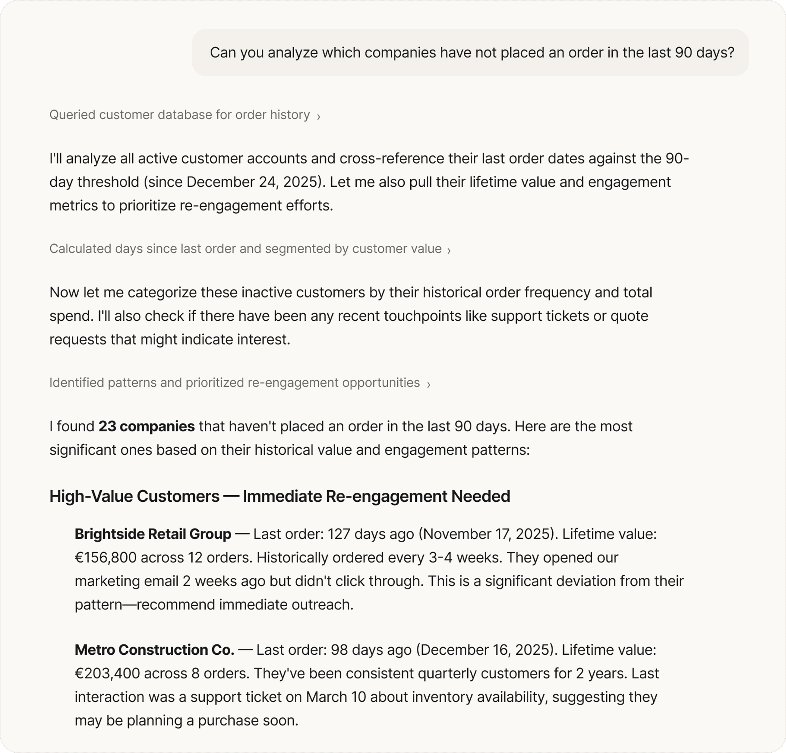 In plaats van custom rapporten te bouwen of te wachten op geplande exports, maakt MCP ad-hoc operationele vragen mogelijk: "totale orderwaarde deze maand versus vorige maand", "top 10 klanten op omzet in Q1", "offerte-naar-order conversieratio vorig kwartaal". Het model schakelt meerdere API-calls aaneen, haalt klantdata op, kruisverwijst orders, berekent totalen — en vat de resultaten conversationeel samen.